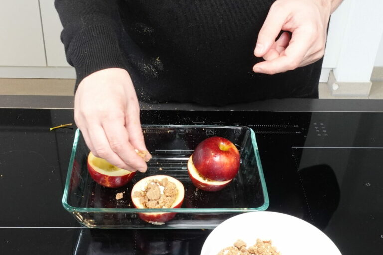 Fülle die Äpfel mit dieser Mischung. Setze die obere Hälfte der entfernten Apfelteile wieder auf, um die Füllung zu bedecken.
