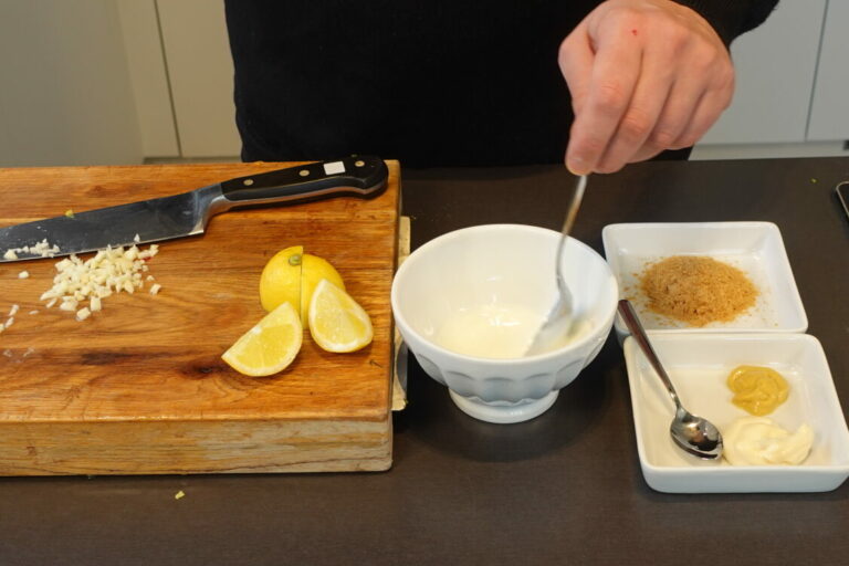 Für das speziell für dieses Gericht kreierte Dressing werden veganer Joghurt, Zitronensaft, vegane Mayonnaise, Senf, eine vegane Alternative zu Worcester Sauce, und Hefeflocken mit fein gehacktem Knoblauch gemischt. Diese Kombination ergibt eine cremige, würzige Sauce, die perfekt zu den Gnocchi und dem knackigen Salat passt.