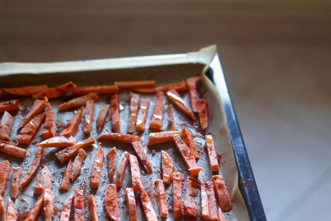 Heize den Ofen auf 200°C vor. Schäle die Süßkartoffeln und schneide sie in etwa 1 cm dicke Streifen. Vermische in einer Schüssel das Olivenöl mit Paprikapulver, Knoblauchpulver, Salz und Pfeffer. Wende die Süßkartoffelstreifen in der Mischung, bis sie gleichmäßig bedeckt sind. Breite sie auf einem mit Backpapier ausgelegten Backblech aus, sodass sie nicht übereinanderliegen. Röste sie im Ofen für 20 Minuten, bis sie weich und an den Rändern leicht knusprig sind, dabei einmal wenden.