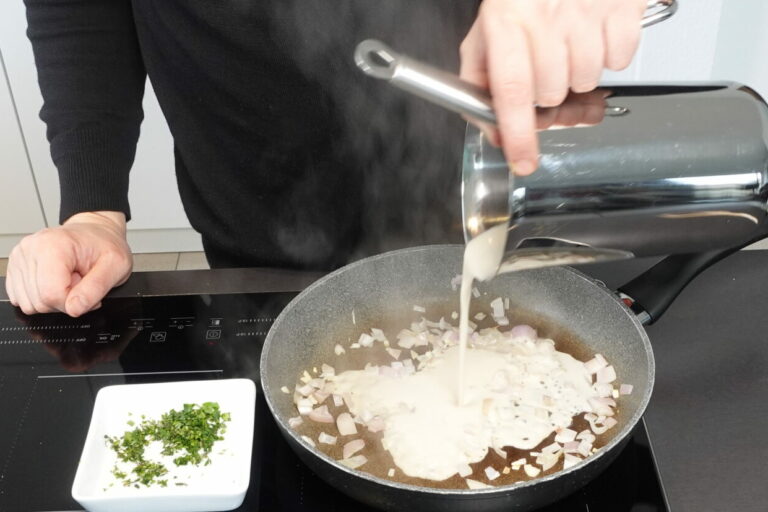 Gib Nudeln und Brokkoli in die Pfanne zu den Schalotten und dem Knoblauch. Gieße die Cashewsauce über das Gemüse und mische alles gut durch. Falls die Sauce zu dick ist, kannst Du ein wenig vom Kochwasser von den Nudeln hinzufügen, um die gewünschte Konsistenz zu erreichen.