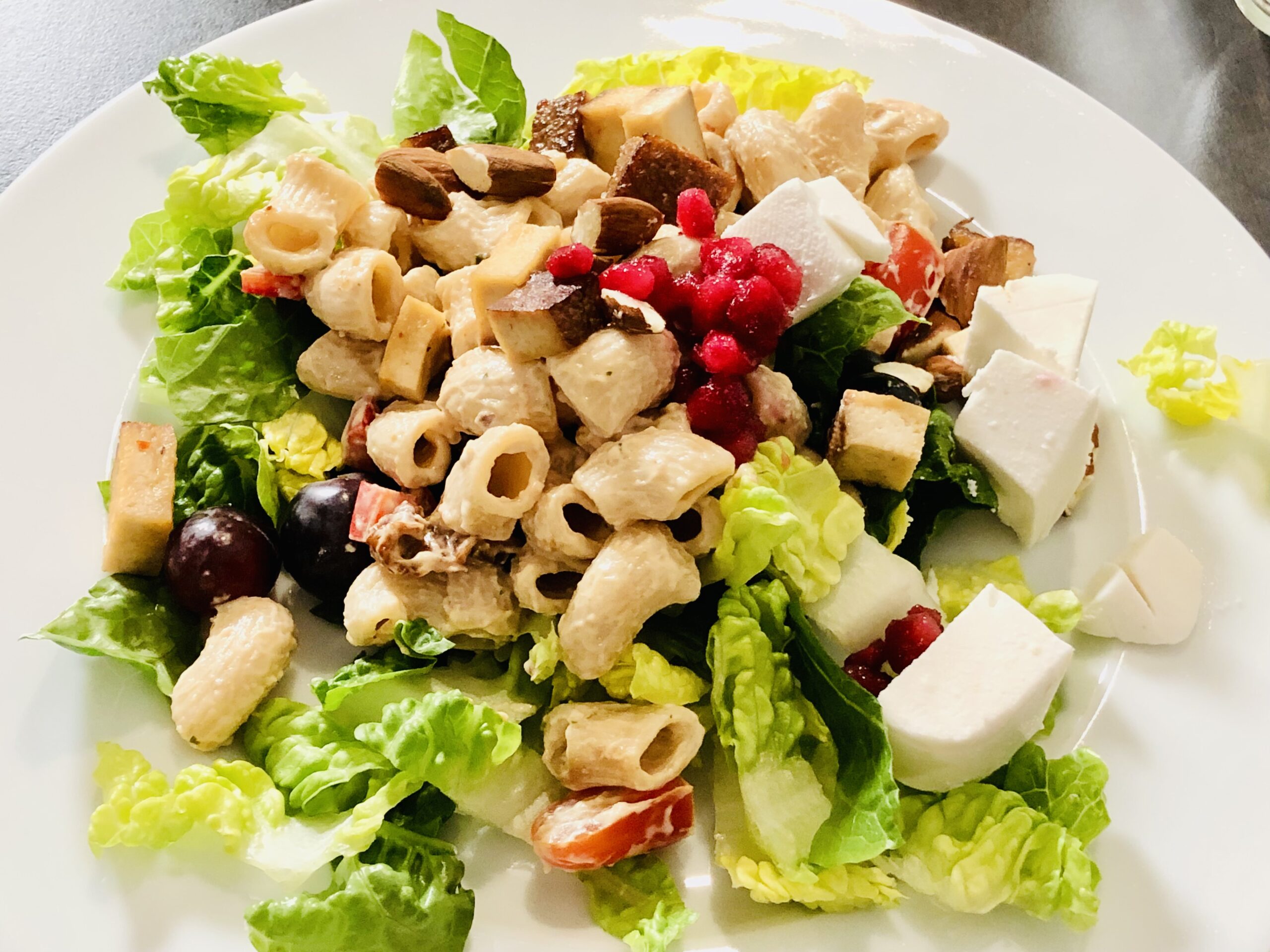 In einer großen Schüssel Pasta mit Römersalat, getrockneten Tomaten, Cherrytomaten, roten Trauben, Tofu, Mandeln und dem Dressing vermengen und servieren.