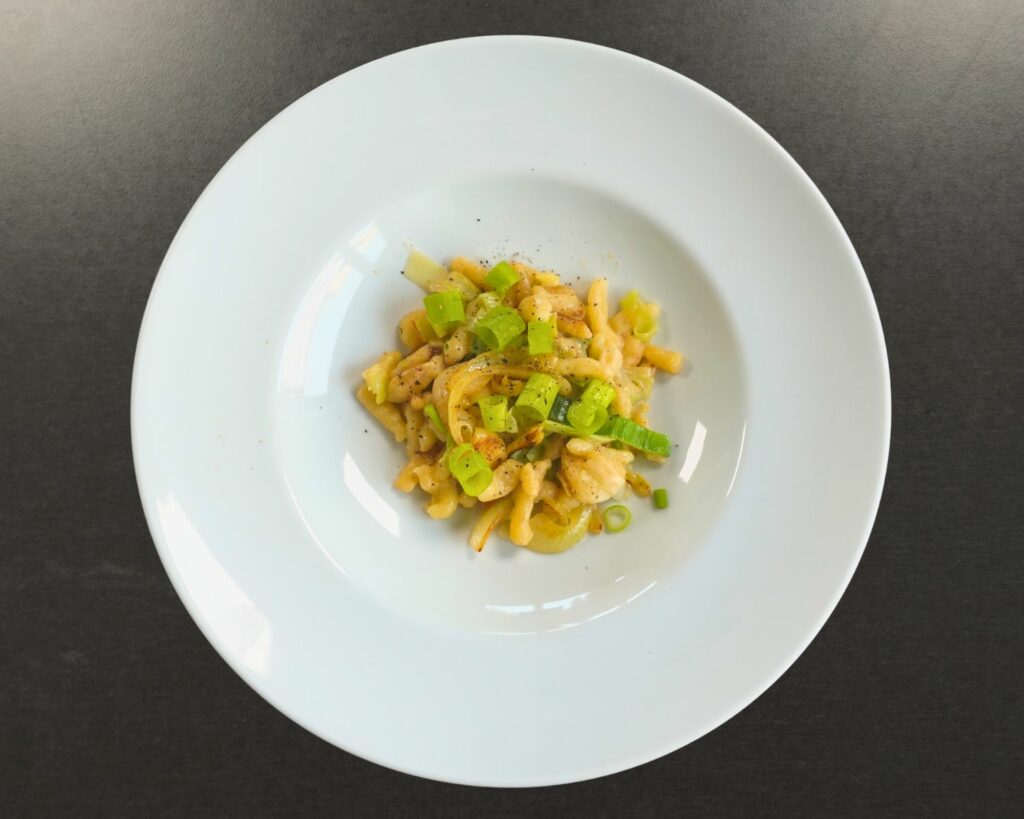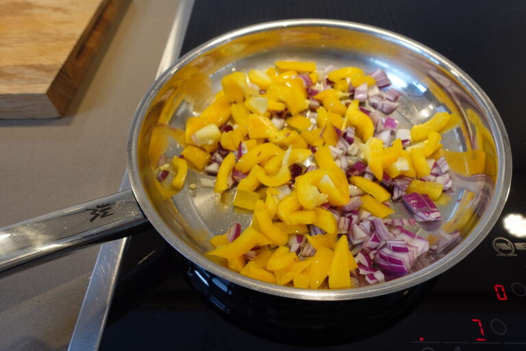 1 TL Öl in der Pfanne erhitzen. Paprika und Zwiebeln 1-2 Minuten glasig andünsten.