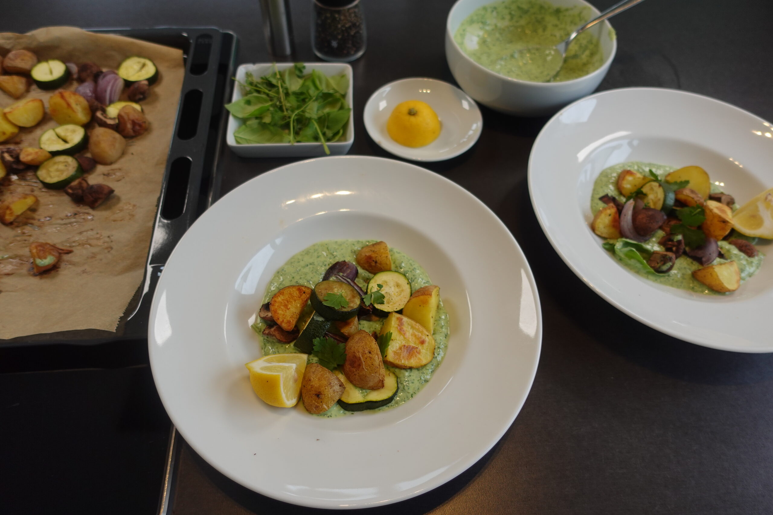 Sobald das Gemüse fertig gebacken ist, nimm es aus dem Ofen und lass es kurz abkühlen. Serviere das Ofengemüse auf Tellern und gib großzügig von der grünen Sauce darüber. Jetzt kannst Du Dich zurücklehnen und mit jemand Besonderem dieses wunderbar einfache, aber leckere Gericht genießen.